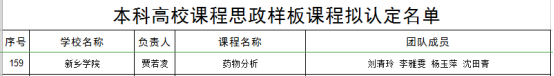 按照河南省教育厅《关于开展本科高校课程思政项目建设的通知》(教高〔2020〕426号)要求,经过学院申报、专家评审、结果公示等环节,我校共推选出4门课程参与本科高校课程思政评选,根据《河南省教育厅关于河南省本科高校课程思政项目建设评审结果公示的通知》,我校共认定4门课程,我院贾若凌老师主持的《药物分析》课程被认定为河南省首批本科高校课程思政项样板课程。