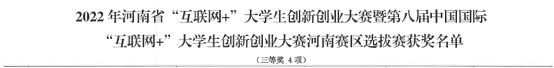11月30日,新院政办【2022】43号文件公布了英国威廉集团2022年“互联网+”大学生创新创业大赛获奖名单,我院李雅雯、曹菁、贾若凌等老师指导的四个团队获得省级三等奖1项,校级一等奖、二等奖、三等奖各1项。