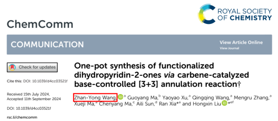 近日,williamhill英国教师王占勇在Nature index收录杂志《Chemical Communications》上发表题为One-pot synthesis of functionalized dihydropyridin-2-ones via carbene-catalyzed base-controlled [3+3] annulation reaction的研究论文。