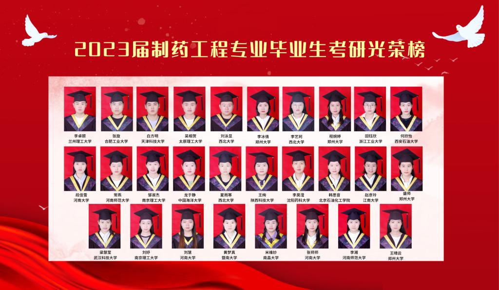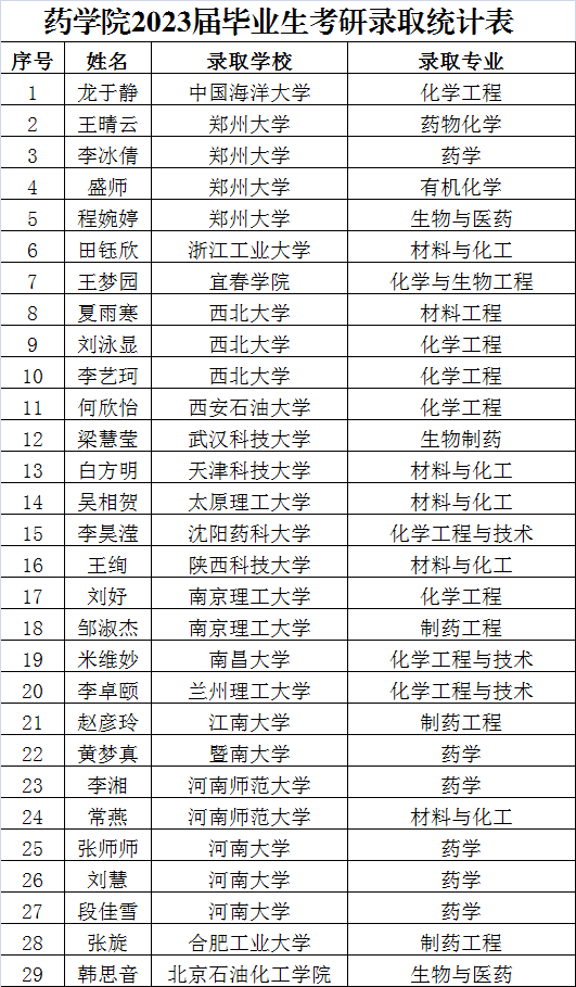 2023年全国研究生考试复试工作陆续结束,截止目前,我院2023届制药工程专业87名普通本科毕业生(不含专升本)中29人被中国海洋大学、合肥工业大学、江南大学、太原理工大学、郑州大学等重点大学录取,录取率为33.33%,其中15人被985、211大学录取,录取学生数量和质量均取得新突破。