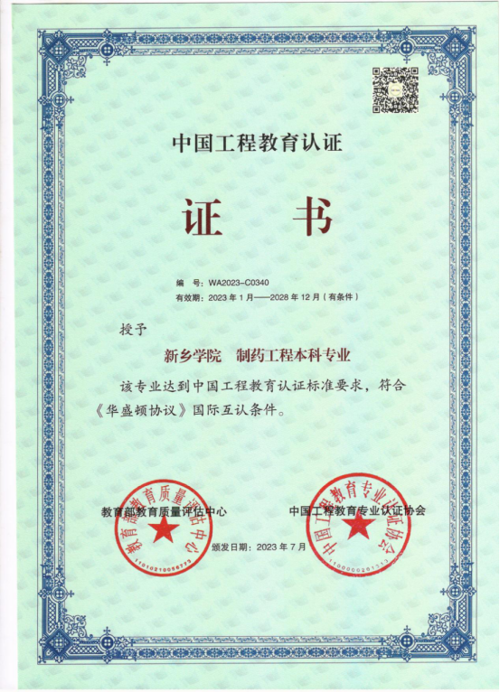 近日,教育部高等教育教学评估中心、中国工程教育专业认证协会为我院制药工程专业颁发认证证书,认证时效6年(2023年1月-2028年12月)。